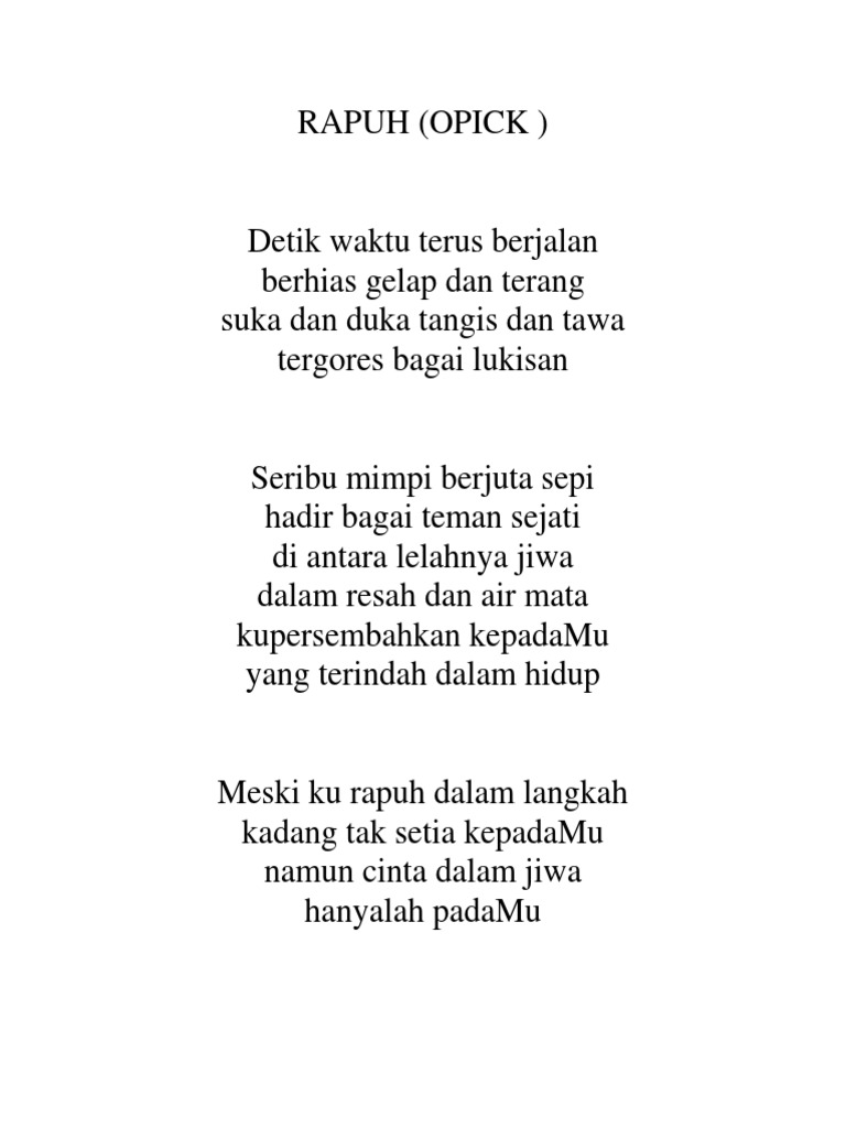 Verse 1 Belum sempat ku membagi. 0 View save list. Opick - Rapuh By Lirik Lagu On 12 August 2018.